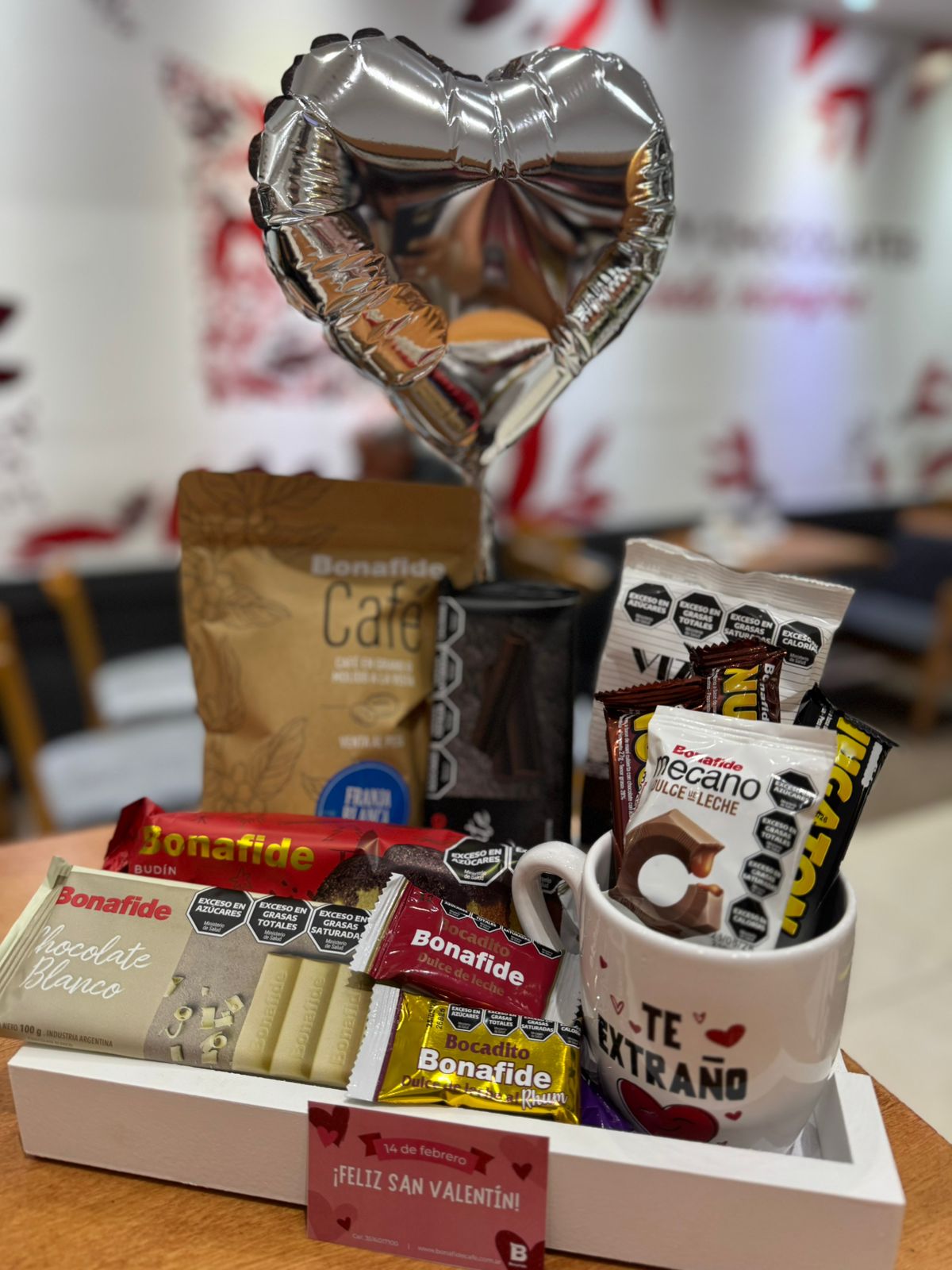 El Desayuno San Valentín es una propuesta completa y romántica para sorprender desde la mañana. Incluye una selección premium de chocolates, dulces y café Bonafide, acompañados por una taza con frases de amor y presentados en una bandeja ideal para regalar.